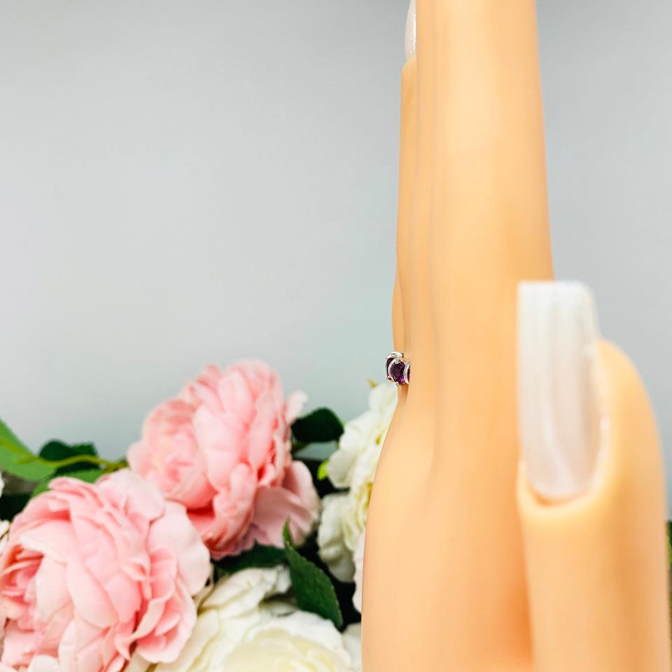 This is a lovely band that is set with five 4mm round natural wine color almandine garnet gemstones. This type garnet, that looks very similar to high end rhodolite garnet, has a rich purplish wine color. The vast majority of almandine garnet is red.