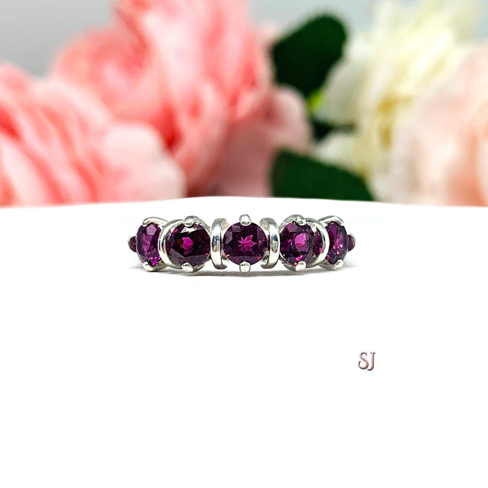 Natural Garnet Five Stone Ring January Birthstone Sterling Silver 4mm Round Wine Color SIZE 7 FINAL SALE