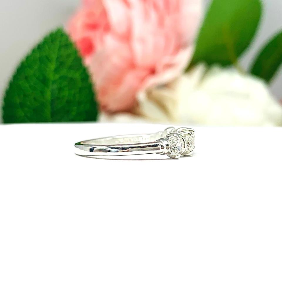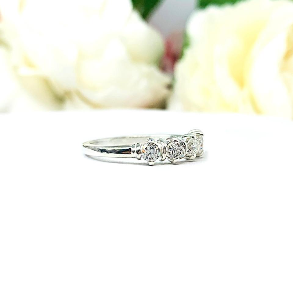 This lovely ring is set with five very light yellow tint (near colorless) high quality round brilliant cubic zirconias. These czs are precision faceted and look very much like near colorless diamonds. The light yellow tint enables them to look very much like G or H color diamonds.