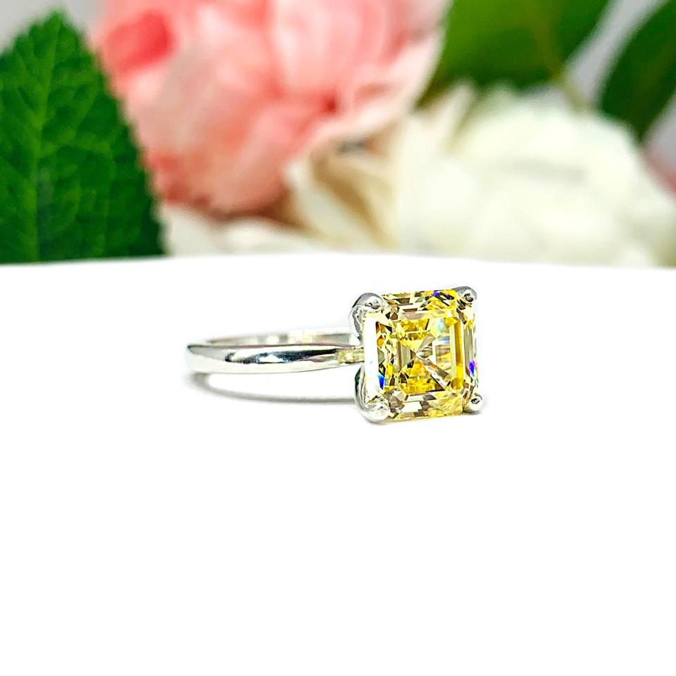 This is a beautiful solitaire engagement ring set with a pricey canary yellow high quality asscher cut cubic zirconia.