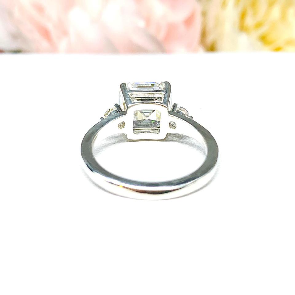 This ring is STUNNING! I love Asscher cut stones, and this ring is just magnificent. It sparkles so much that when I took it outside to see it in the sun, I literally got sunspots from the dazzle of the stone! The side stones are a real perk. Yes, they are small, and when I placed my order I wasn’t sure if they would be too small to have any presence, but they glitter like crazy! I especially like that they are round. I think that’s an unexpected shape when paired with an Asscher; I’ve most often seen trillions or trapezoids, neither of which float my boat. These rounds are the perfect size, and add to the magnificence of this ring. Finally, the mounting is weighty and very well constructed. I just love everything about this ring, and you will, too! Shannon is a lovely person, and I look forward to future purchases from her.