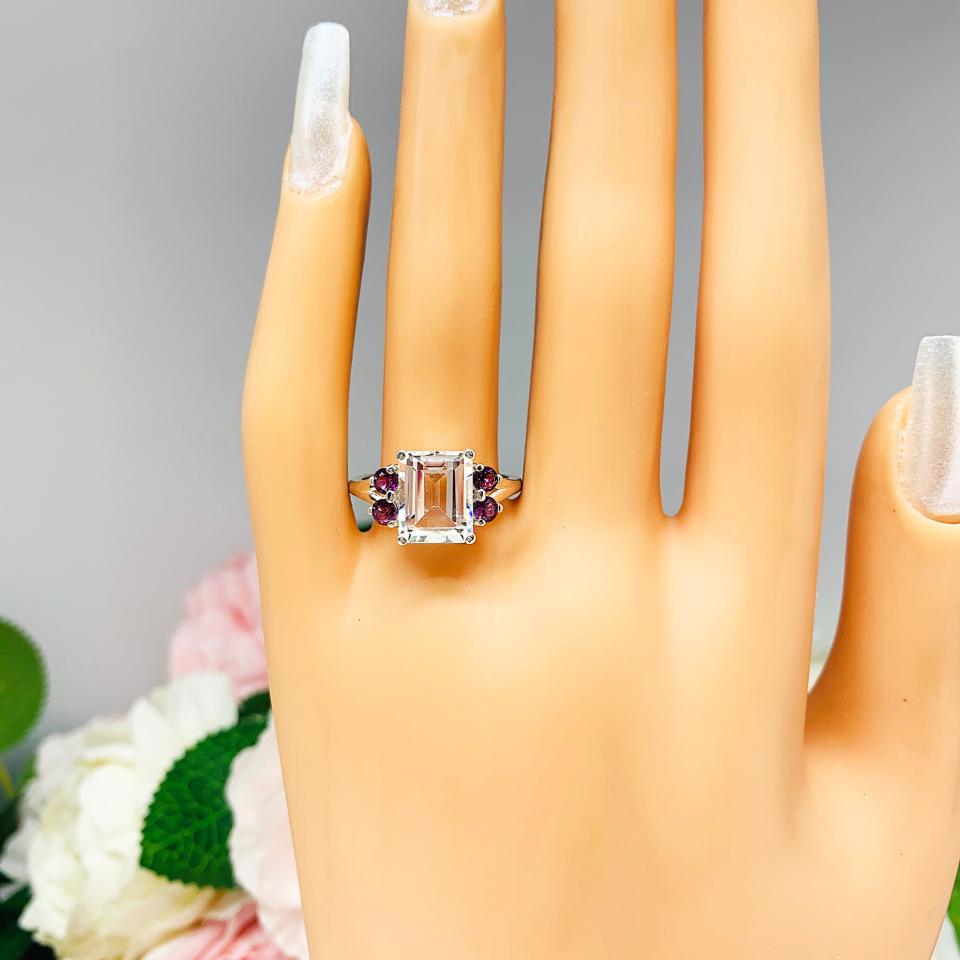 This is a beautiful sterling silver ring set with an emerald cut natural white topaz and wine color garnet gemstones.
