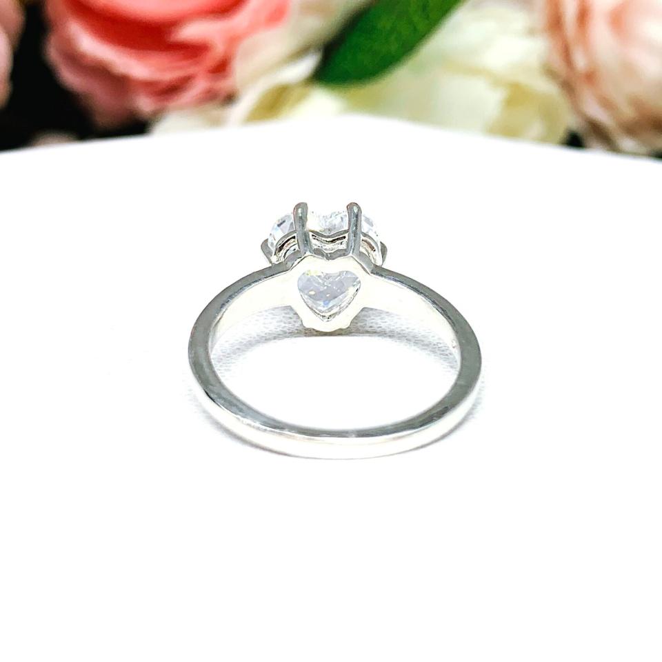 This lovely ring features a heart cut precision faceted cubic zirconia. This high quality stone is set in a sturdy, solid, non-plated, sterling silver six prong solitaire setting. The ring would make a lovely diamond ring alternative.