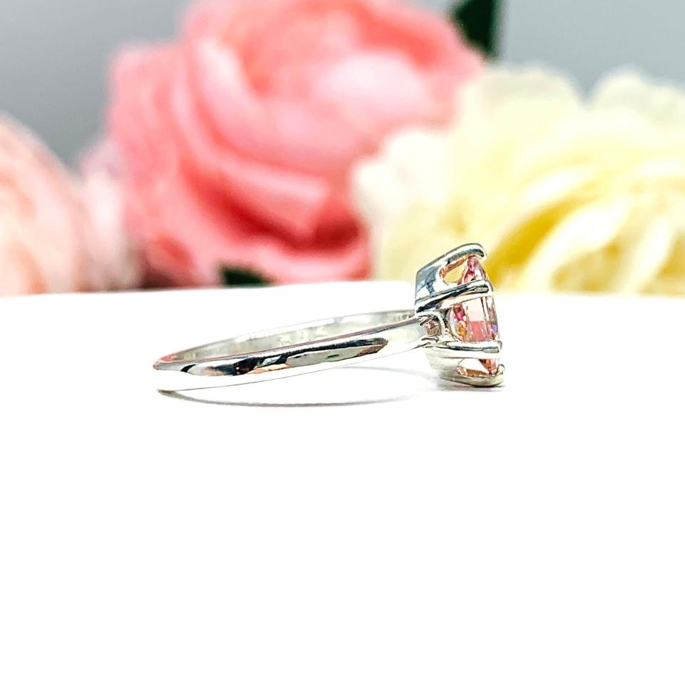 This is a solitaire ring set with a high quality, beautiful Swarovski morganite (pink with a hint of peach) color oval cut cubic zirconia.