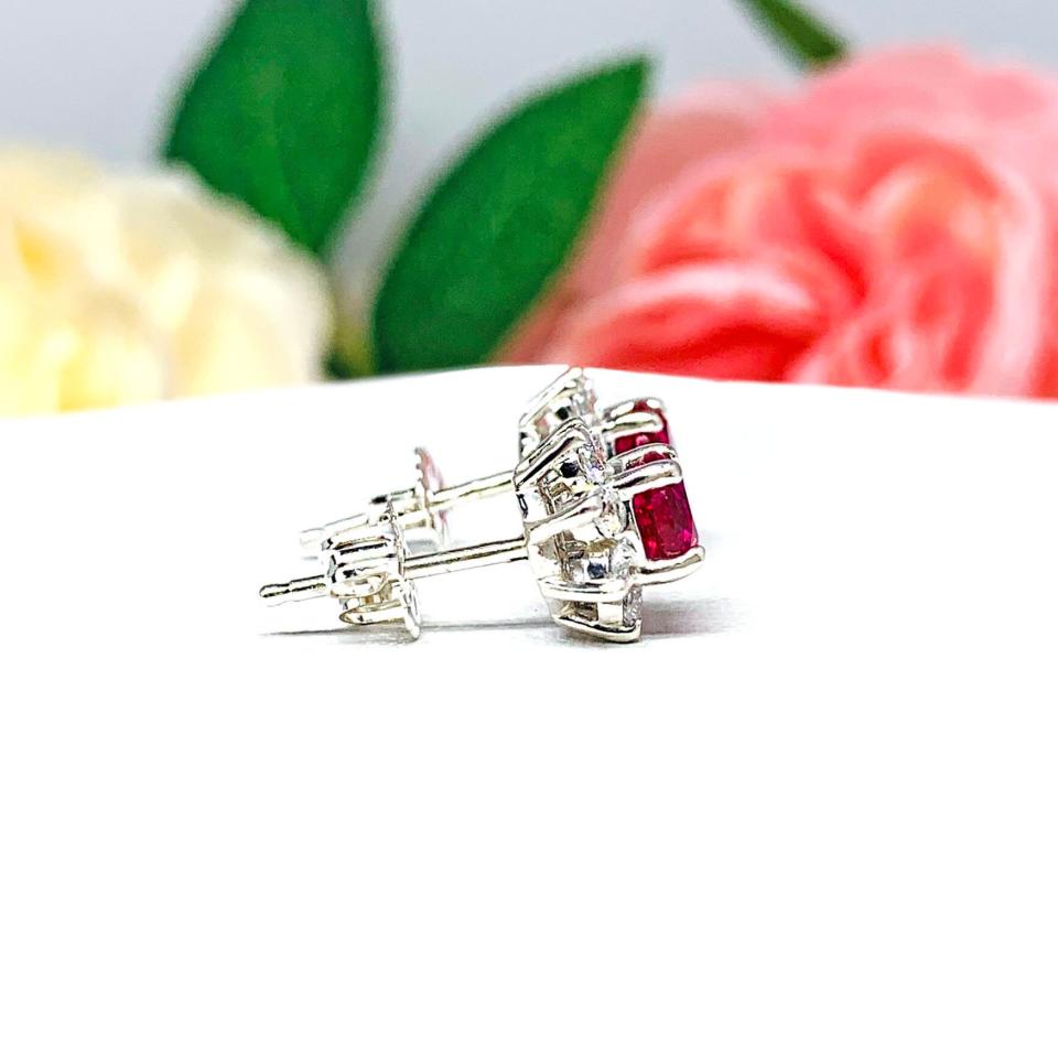 These beautiful round halo sterling silver stud earrings feature round lab created rubies and 6A round brilliant czs. These settings are very sturdy, have four prongs and come with butterfly friction clasps.